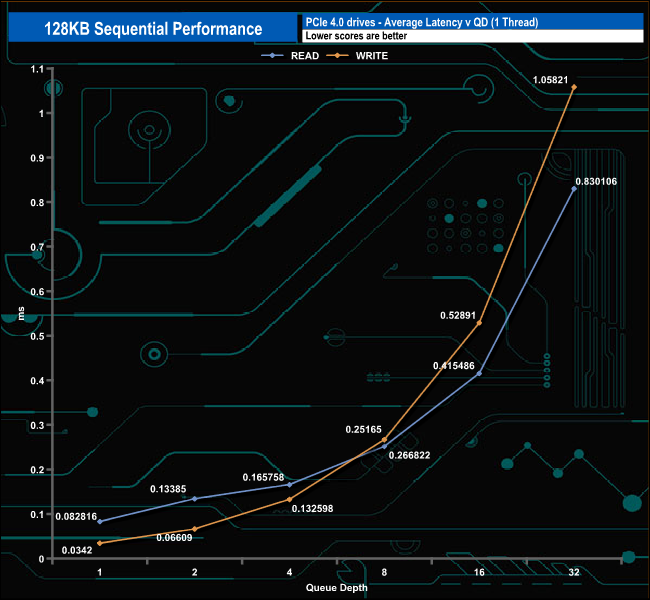 We used CrystalDiskMark 8‘s custom settings to test the Sequential read and write performance of the drive through a range of queue depths. The setup for the tests is listed below.