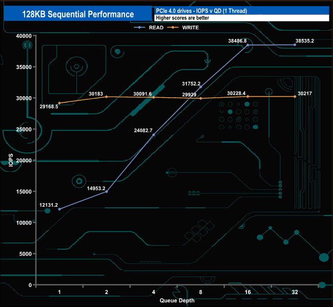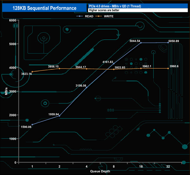With our 128KB Sequential tests, we could confirm both the official ratings for the drive of up to 5,000MB/s for reads and up to 3,900MB/s for writes with best test result figures of 5,050MB/s and 3,962MB/s for reads and writes respectively.
