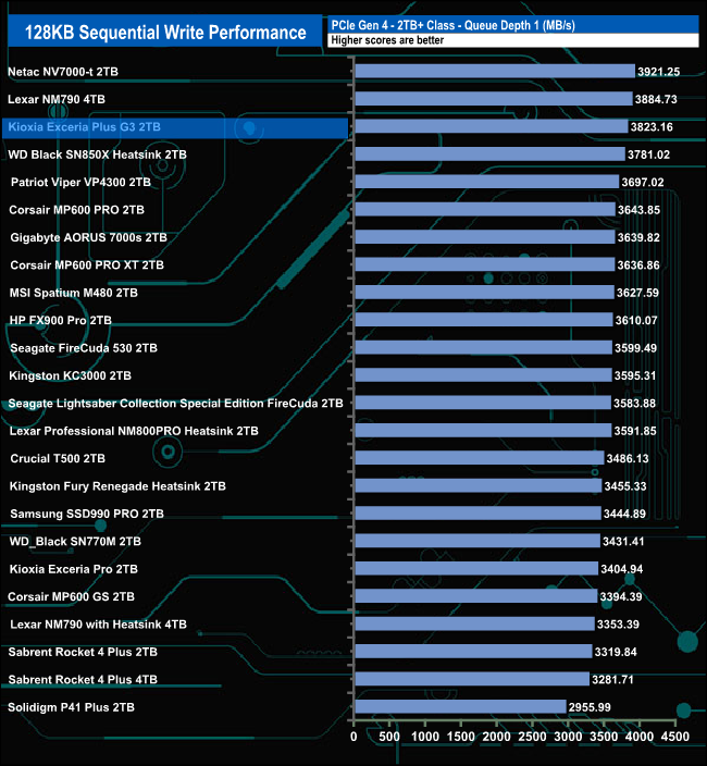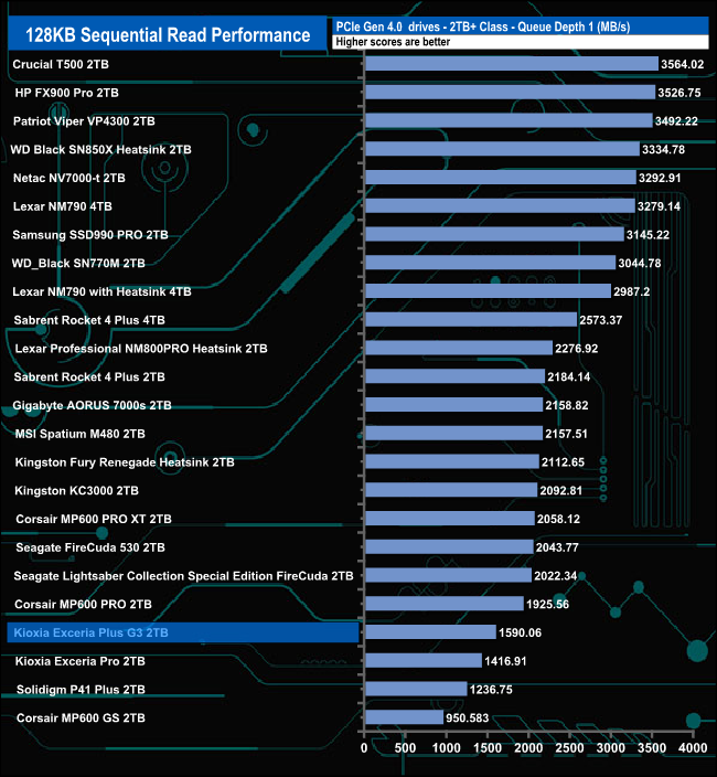 The Kioxia Exceria Plus G3's best performance comes at QD1 where it sits third in the results chart but as the QD deepens the performance drops off and the drive falls down the table.