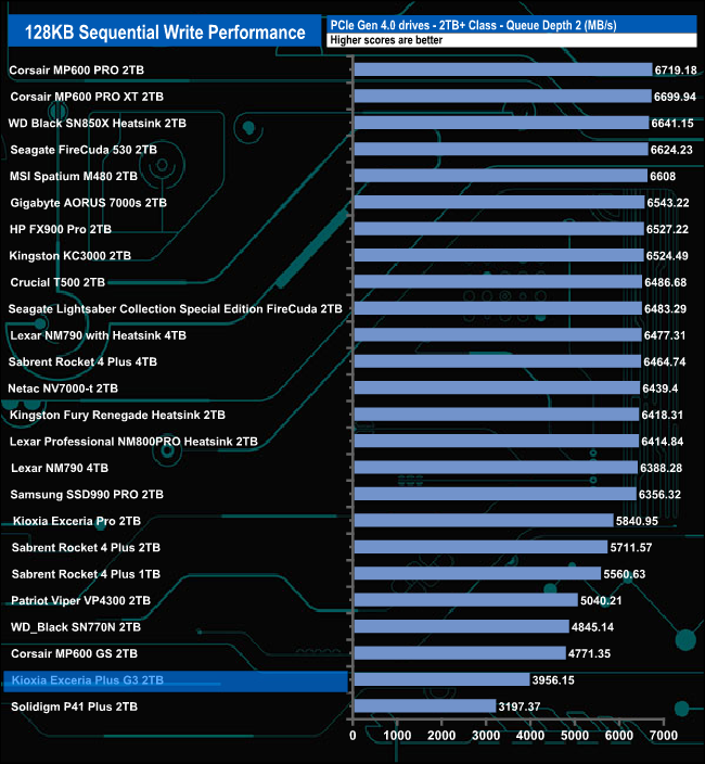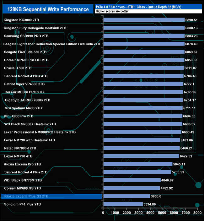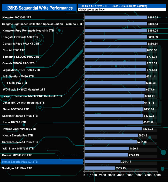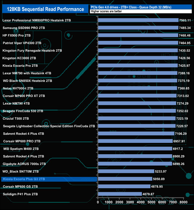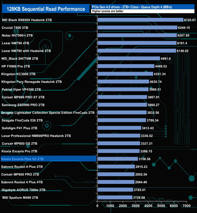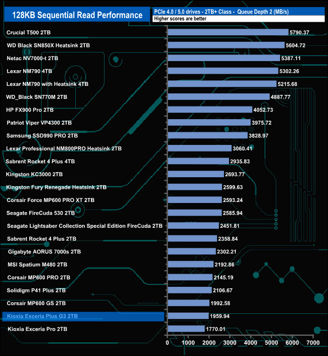 In relation to the drives sitting around it, the Exceria Plus G3 performs best at QDs 1 and 4. At QDs 2 and 32, it's very close to the bottom of the chart.