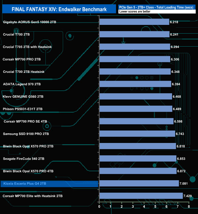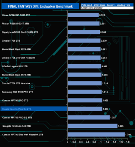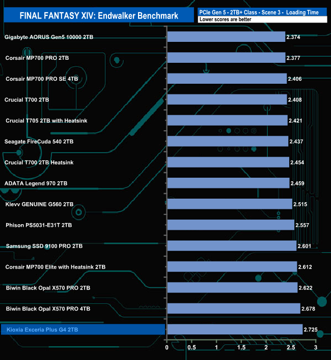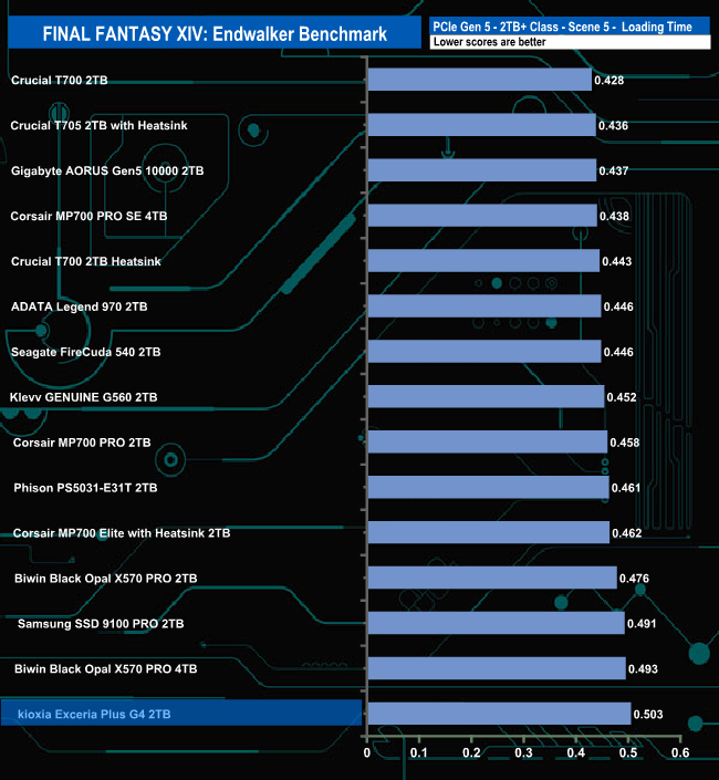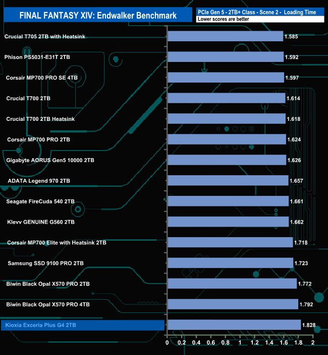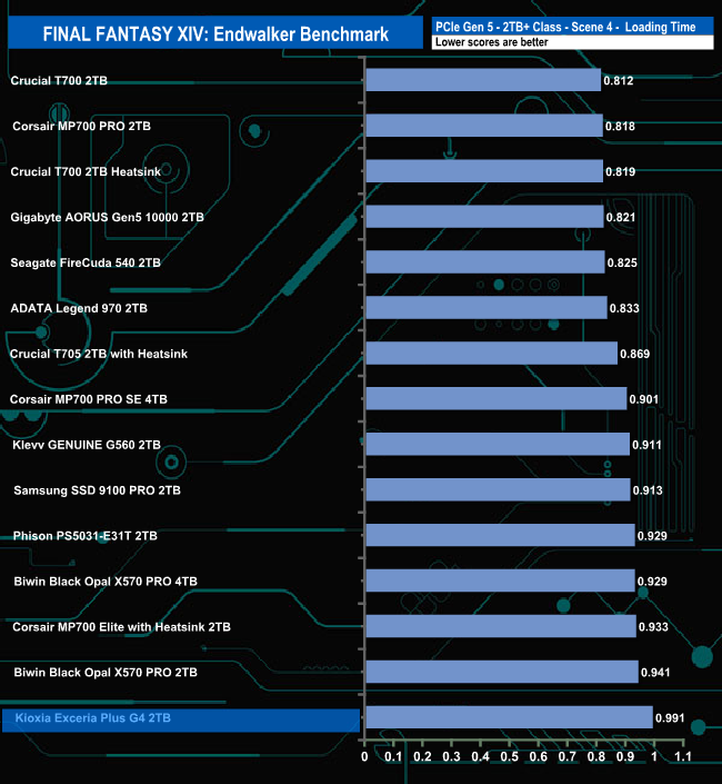 Kioxia's Exceria Plus G4 doesn't appear to handle the Final Fantasy XIV Endwalker Official Benchmark very well at all, sitting in last place for all bar one (Load Scene 1) of the scene-loading tests.