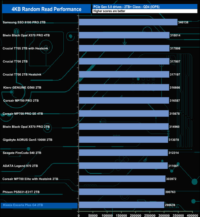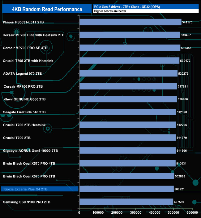 At QDs1 and 2, Kioxia's Exceria Plus G4 is the second-fastest Gen5 consumer drive we've seen to date for this test, and it's the fastest E31 T-based drive we've seen at these queue depths. However, at QD4, the drive dropped to last place in the results chart, and at QD3,2 it recovers slightly.