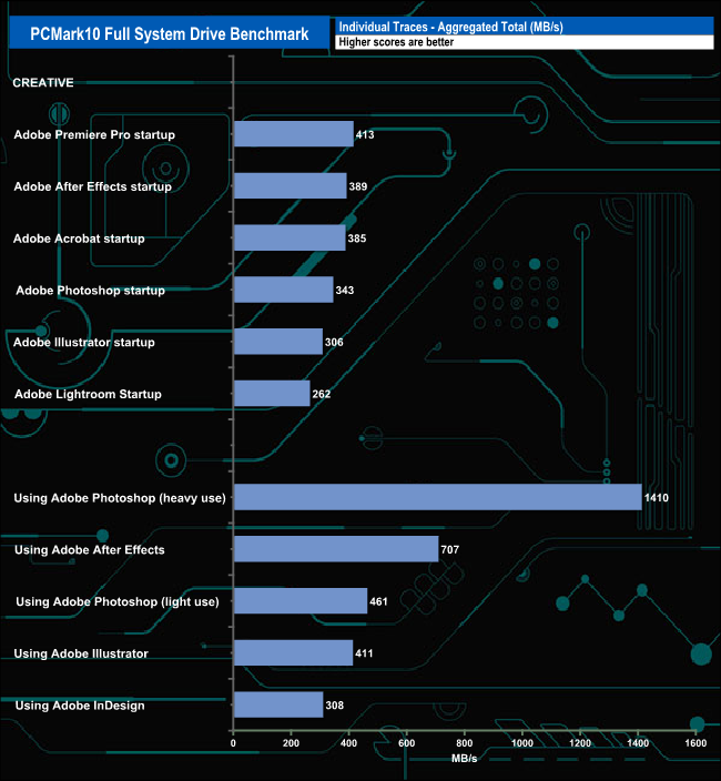 Switching to the five Adobe usage traces, it averaged 659MB/s for the five tests, including the 1,410MB/s figure for the Adobe Photoshop heavy usage trace.