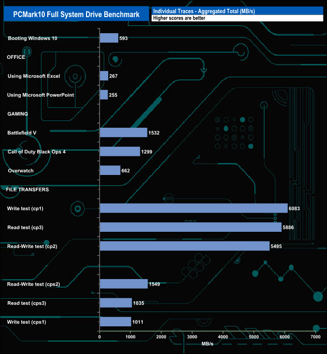 The PCMark 10 Full System Drive Benchmark uses a wide-ranging set of real-world traces from popular applications and common tasks to fully test the performance of the fastest modern drives. The benchmark is designed to measure the performance of fast system drives using the SATA bus at the low end and devices connected via PCI Express at the high end.
