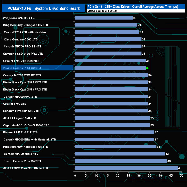 The 4TB Kioxia Exceria PRO G2 does a good enough job with PCMark10's Full System Drive Benchmark without being spectacular. It averaged 349MB/s for the six Adobe startup traces, the fastest being 413MB/s for the startup test trace of Premiere Pro, the slowest being the Lightroom startup trace at 262MB/s.