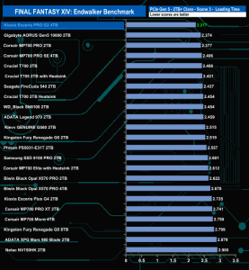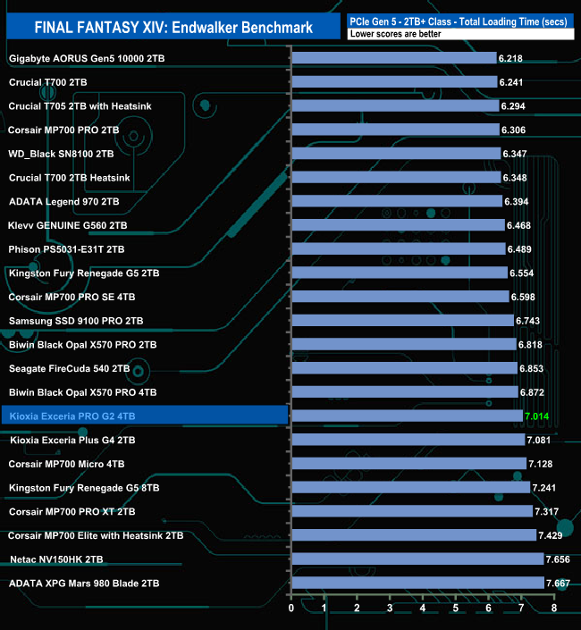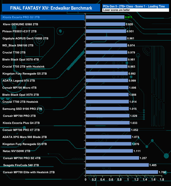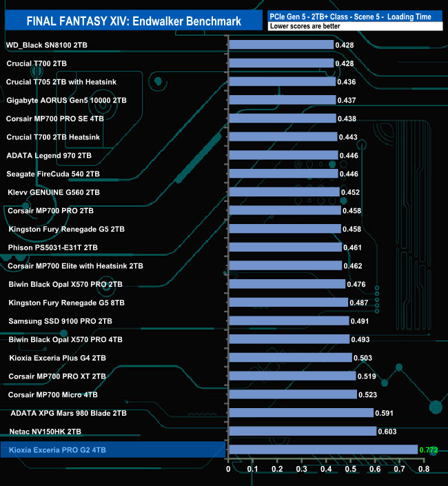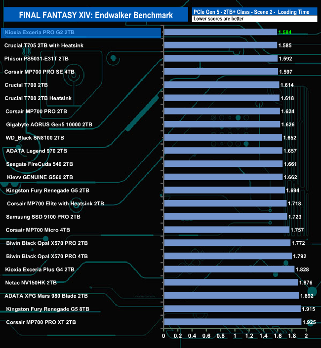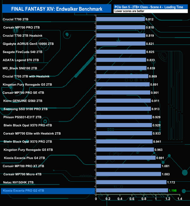Kioxia's Exceria PRO G2 handles the Final Fantasy XIV Endwalker Official Benchmark pretty well, topping three of the load scenes but sitting in last place for the remaining two tests.