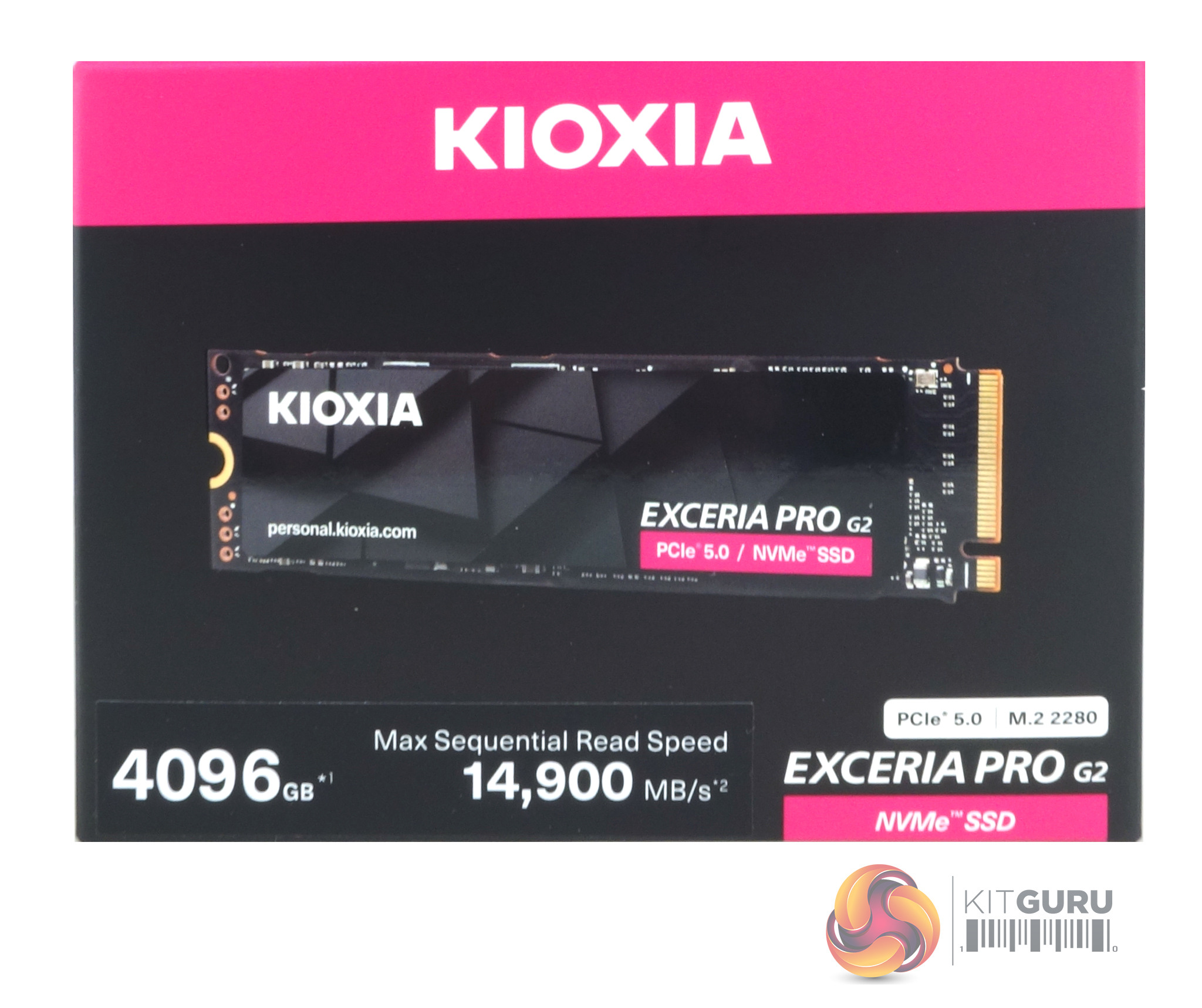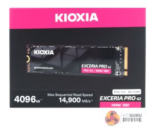 Kioxia's Exceria PRO 4TB comes in a compact box with the drive image on the front and a sticker displaying its capacity and sequential read speed (up to 14,900MB/s).