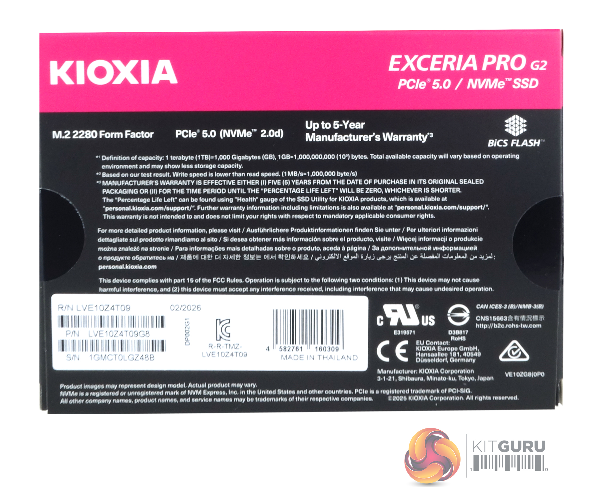 The rear of the box includes a description of the drive’s form factor, a small logo indicating it uses BiCS Flash, a PCIe 5.0 (NVMe 2.0d) interface, and a 5-year warranty.