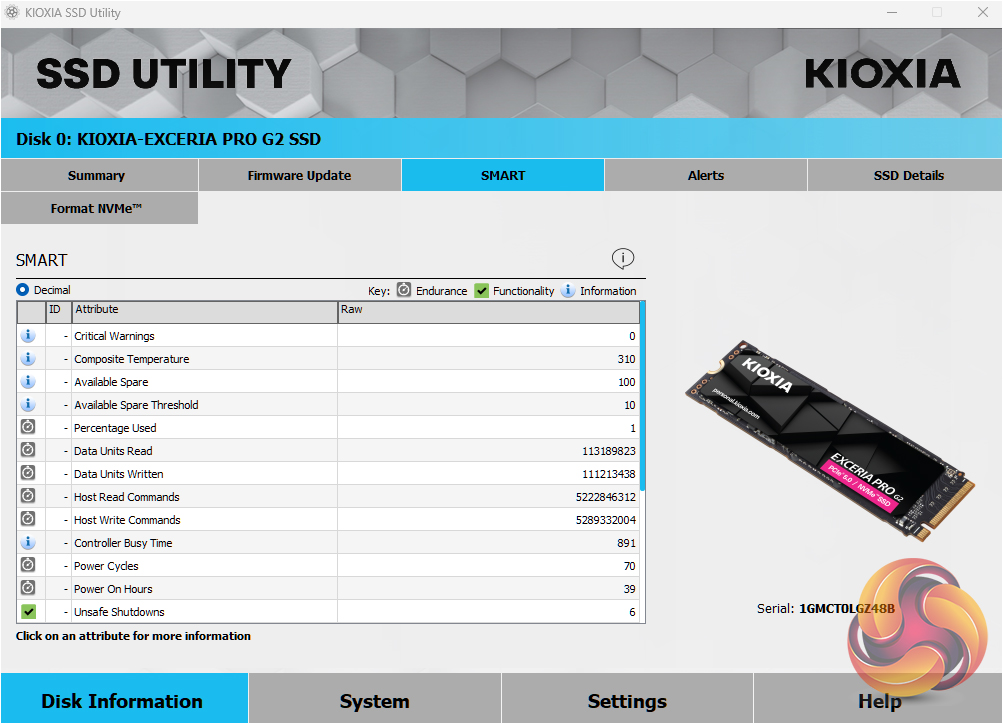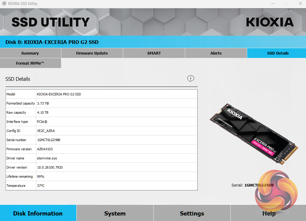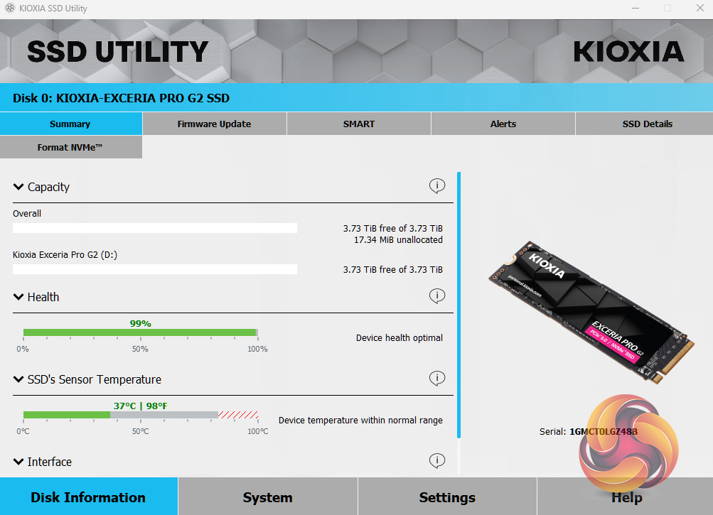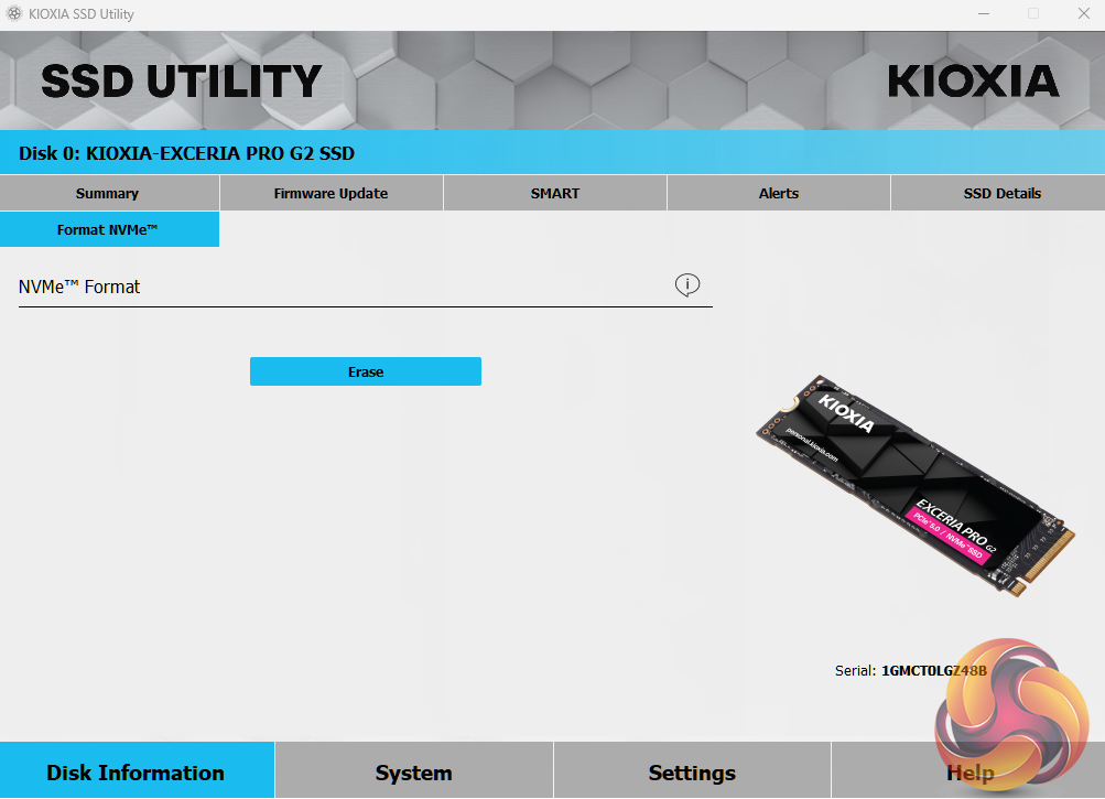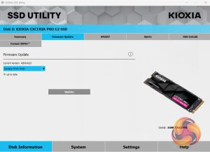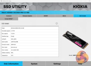 Kioxia's SSD Utility drive management software has four main sections: Disk Information, System, Settings and Help. All the key tools are to be found on the Disk Information page under separate tabs. These allow you to check drive capacity usage, health and temperature, SMART information, drive alerts and perform operations such as firmware updates and secure erase.
