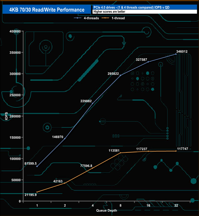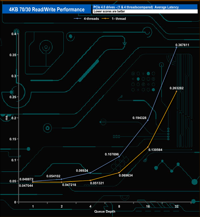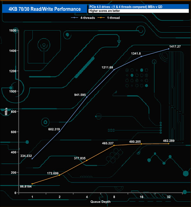 We used CrystalDiskMark 8’s custom settings to test the 4K 70/30 mixed read/write performance of the drive through a range of queue depths using a single thread and four threads.