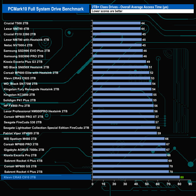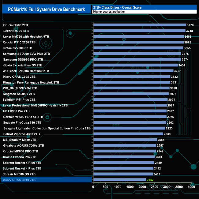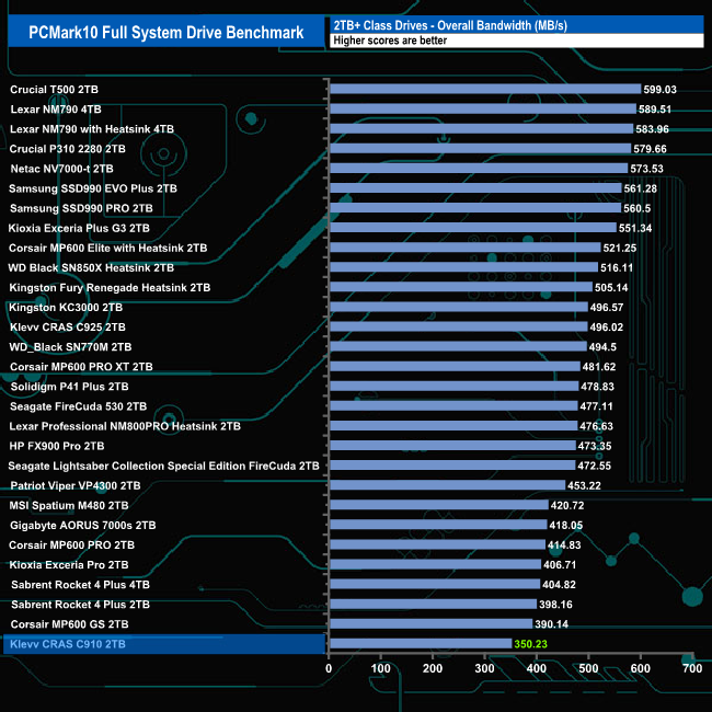 With an overall bandwidth figure of 350.23MB/s, the 2TB Klevv CRAS C910 occupies the last spot on the results chart.