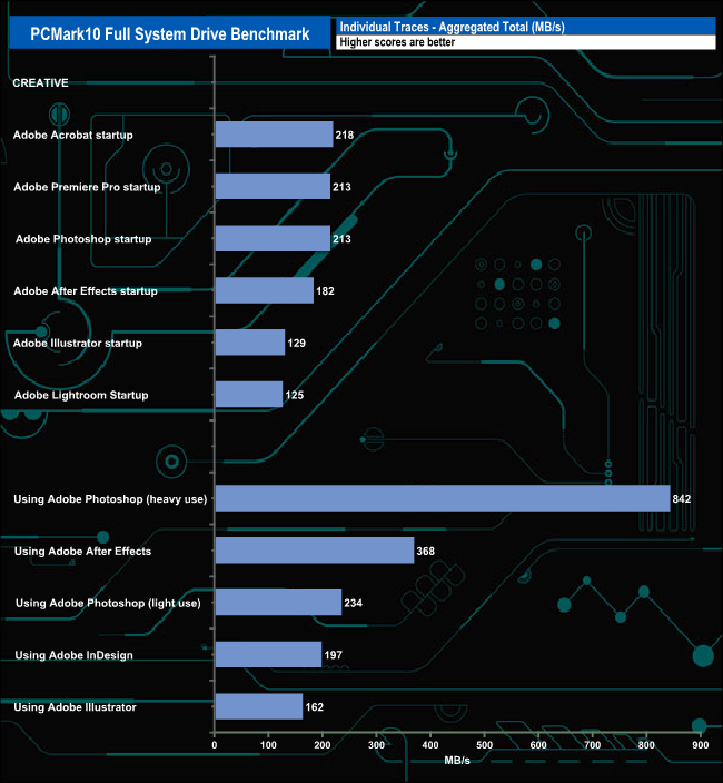 The PCMark 10 Full System Drive Benchmark uses a wide-ranging set of real-world traces from popular applications and common tasks to fully test the performance of the fastest modern drives. The benchmark is designed to measure the performance of fast system drives using the SATA bus at the low end and devices connected via PCI Express at the high end.
