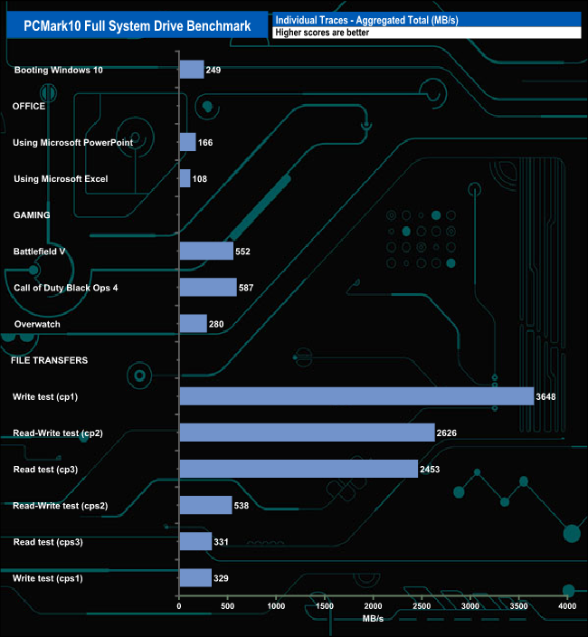 The three gaming traces produced an average result of 473MB/s, the fastest being Battlefield V at 552MB/s. Next came Call Of Duty Black Ops 4 at 587MB/s followed by Overwatch at 280MB/s.