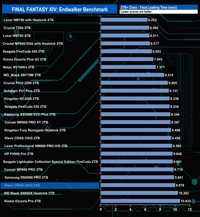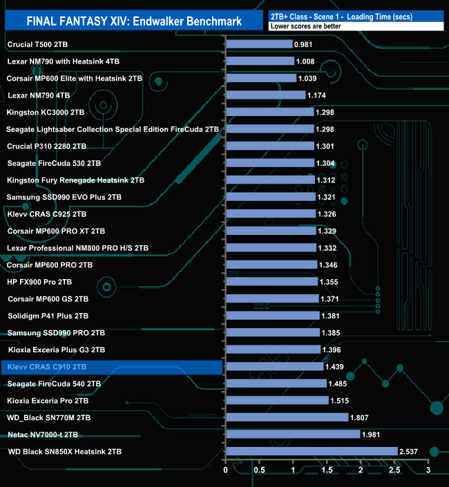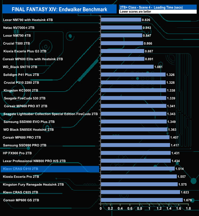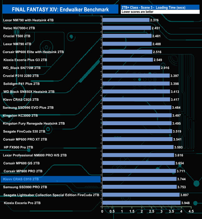 Klevv's 2TB CRAS C910 SSD doesn't appear to handle the Final Fantasy XIV Endwalker Official Benchmark particularly well, ending the test in just third from last place in the Total Loading Time chart. Having said the drive is faster in Scene's 4 and 5 than the CRAS C925.