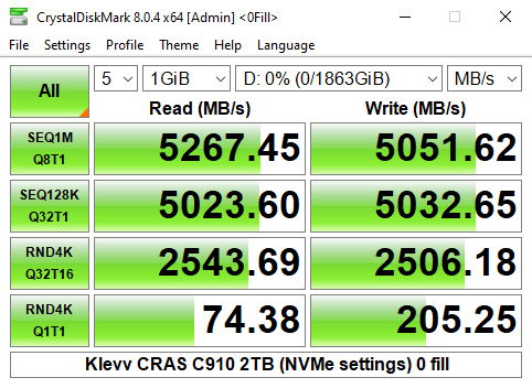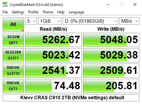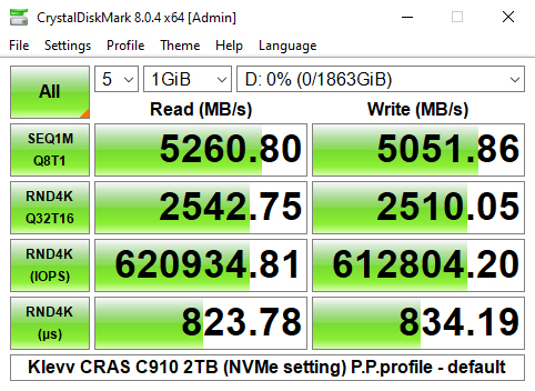 As with the default test, we could confirm both the official maximums (5,200MB/s reads, 4,800MB/s writes) for Sequential performance with test results of 5,260 MB/s for reads and 5,051MB/s for writes.