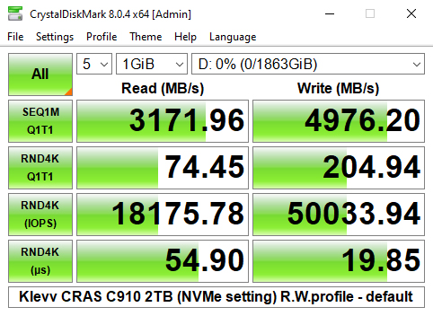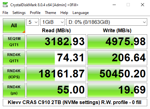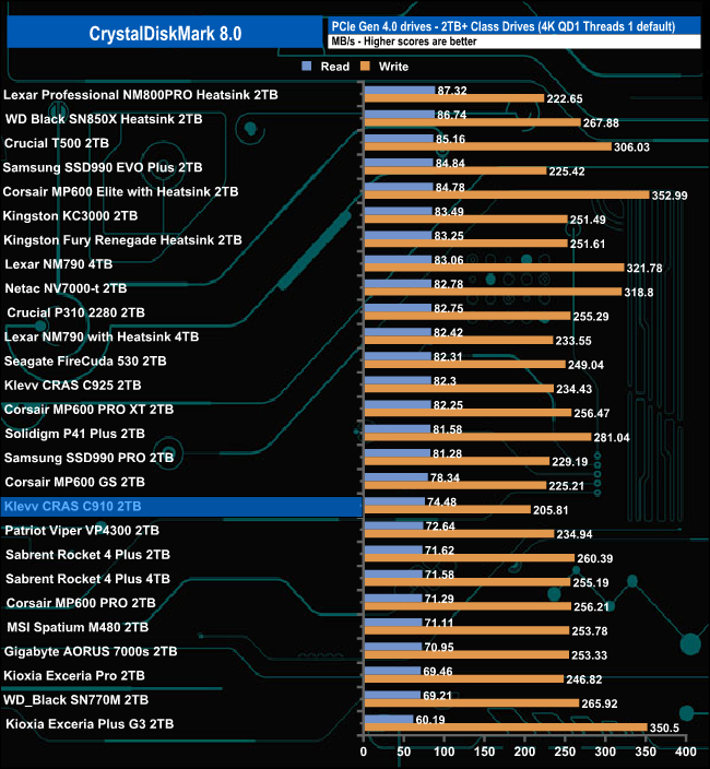 The CRAS C910 read score of 74.48MB/s in CrystalDiskMark 8's 4K QD1 test sees it in the bottom half of the results chart although its write result of 205.81MB/s is the slowest we've seen for a Gen4 SSD to date.