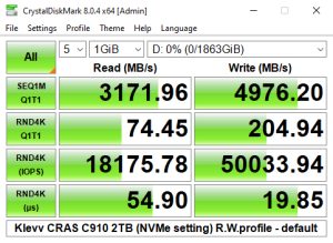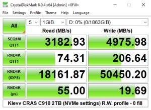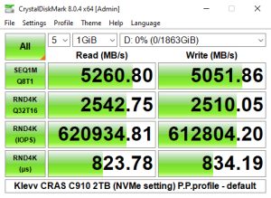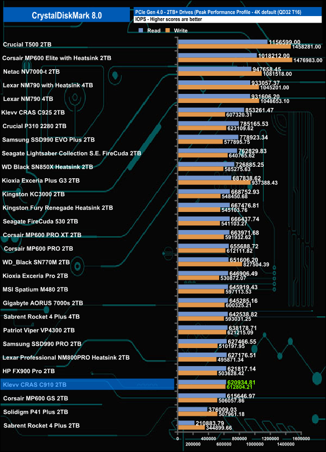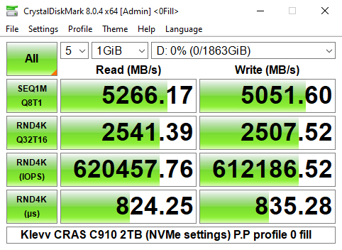 The drive is officially rated at up to 560,000 IOPS for random reads and up to 615,000 IOPS for random writes. Using the Peak Performance profile of CrystalDiskMark8 we could confirm the official read figure and indeed better it a little at 620,934 IOPS. However, the random write figure was a little short of the maximum at 612,186 IOPS.