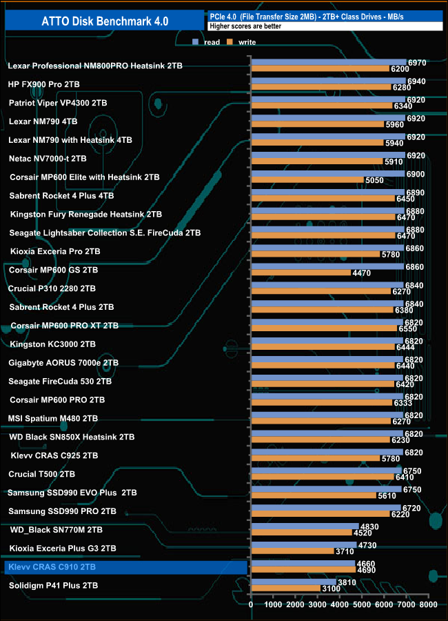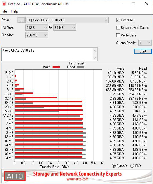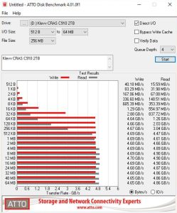 With the ATTO benchmark results the drive fell short of both of the official maximums with a read figure of 5.200MB/s with a test result of 4,660 MB/s but the write performance at 4,690MB/s was closer to the official 4,800MB/s.