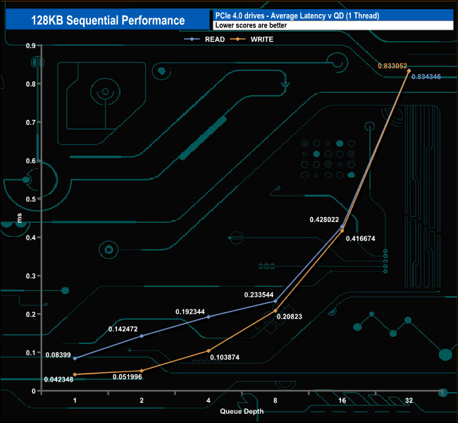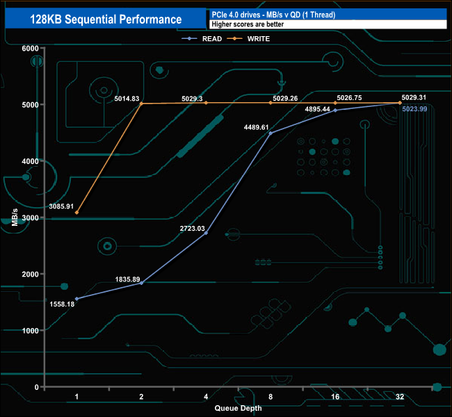 We used CrystalDiskMark 8‘s custom settings to test the Sequential read and write performance of the drive through a range of queue depths. The setup for the tests is listed below.