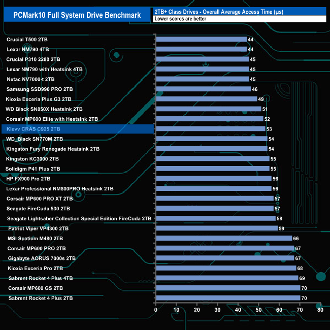 Klevv's 2TB CRAS C925 handled the demands of the PCMark10 Full System Drive Benchmark pretty well. Tested with the six Adobe startup traces it produced an average of 253MB/s with the fastest being the Premiere Pro test trace at 313MB/s, with the Lightroom trace the slowest at 189MB/s.