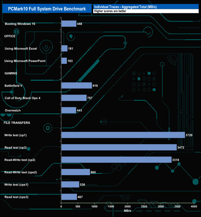 The three gaming traces produced an average result of 706MB/s, the fastest being Battlefield V at 919MB/s. Next came Call Of Duty Black Ops 4 at 757MB/s followed by Overwatch at 443MB/s,