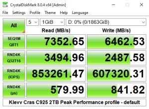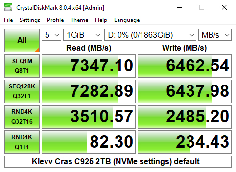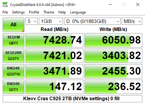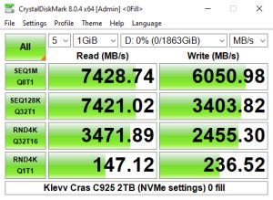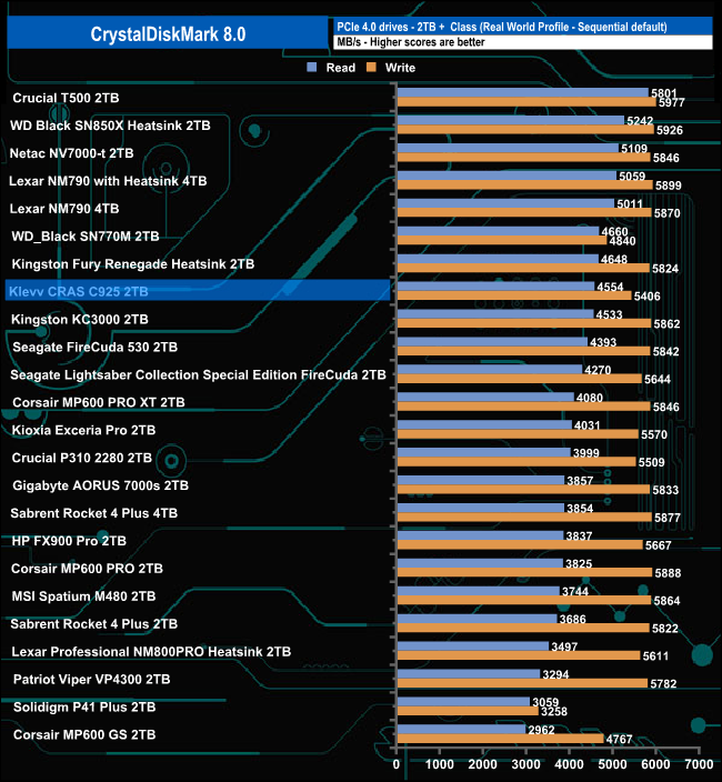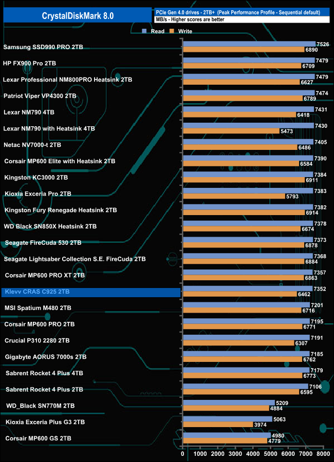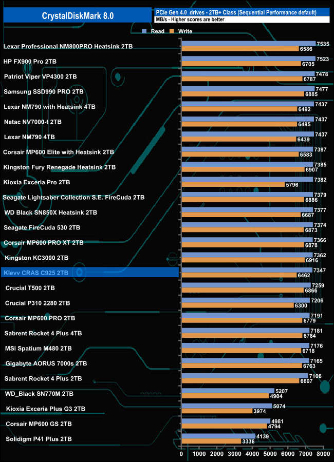 The CRAS C925 Sequential read test result of 7,347MB/s puts the drive into a lower mid position in the results chart.