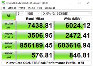 A glance at the benchmark result screens shows that using the default test the drive came up a little short of the official maximums of 7,400MB/s and 6,500MB/s for Sequential reads and writes respectively. Although switching over to the compressible data test we could confirm the official read figure but the write performance dropped some 400MB/s.