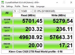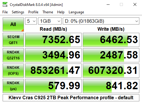 The drive is officially rated at 700,000 IOPS for random reads and using the Peak Performance profile of CrystalDiskMark8 we got a nice increase on the official rating at 853,261 IOPS. However, it was a different story for the random write test, the best we saw was 607,320 IOPS, way off the official 1M IOPS figure.