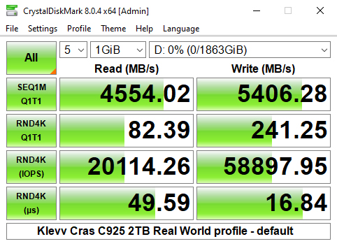 The CRAS C925 read score of 82.3MB/s in CrystalDiskMark 8's 4K QD1 test sees it in the middle of the pack sitting in between the Seagate FireCuda 530 and Corsair's MP600 PRO XT. Its write performance in this test is a little disappointing as both the previously mentioned drives have better write figures.