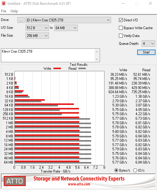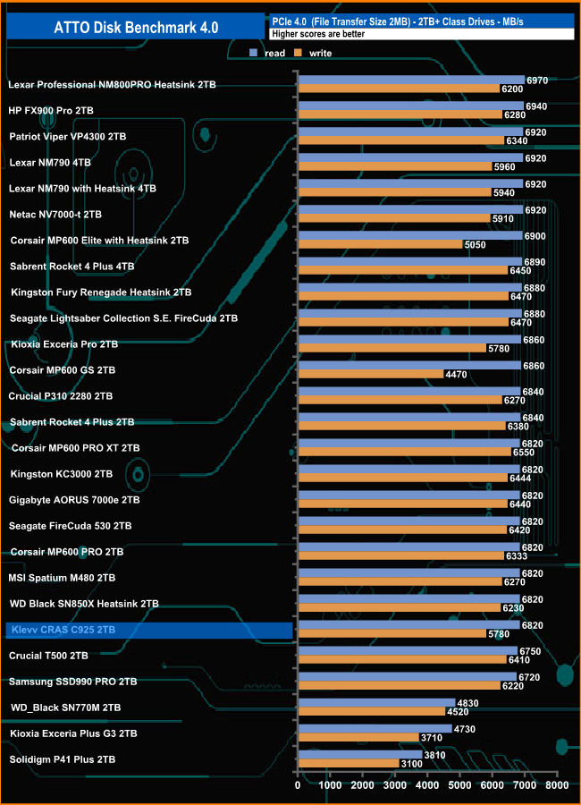 With the ATTO benchmark results the drive fell short of the official 7,400MB/s and 6,500MB/s for Sequential reads and writes respectively, with reads at 6,820MB/s and writes at 5,780MB/s, results which see the drive in the bottom half of the results chart.