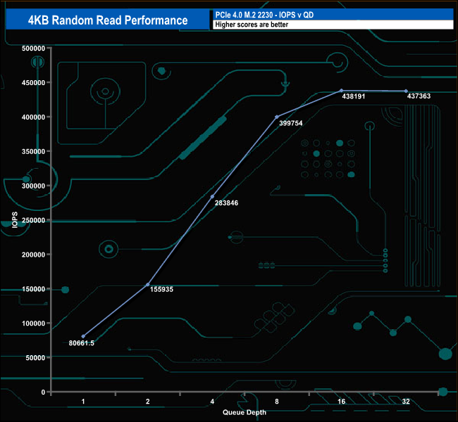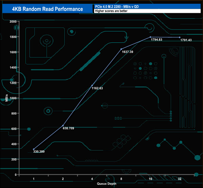 We used CrystalDiskMark 8‘s custom settings to test the 4K random read performance of the drive through a range of queue depths. The setup for the tests is listed below.