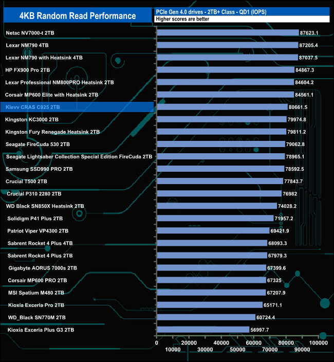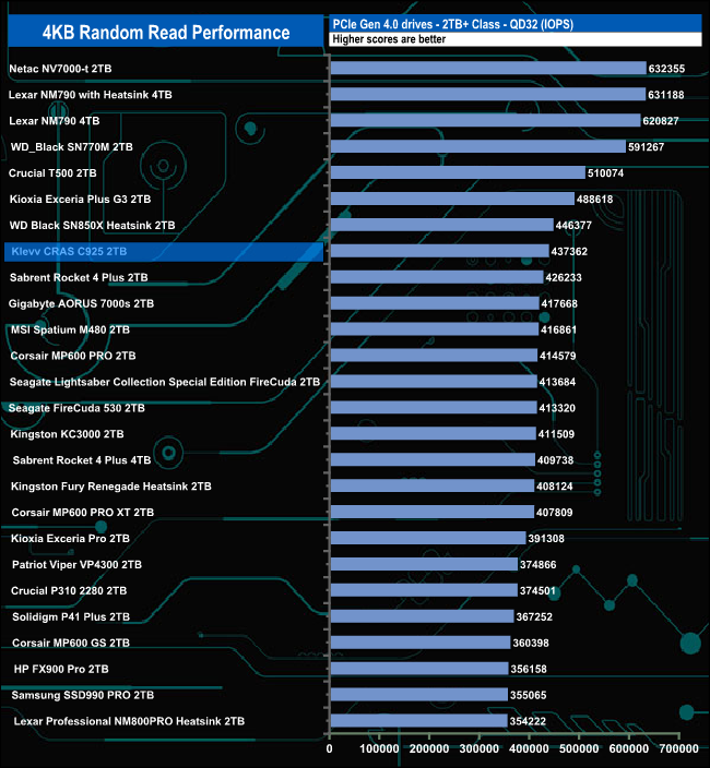 Officially the 2TB CRAS C925 is rated as up to 700,000 IOPS for 4K random reads. With our four-threaded tests, we couldn't get close to the official figure with a peak test result of 438,191 IOPS at QD16.