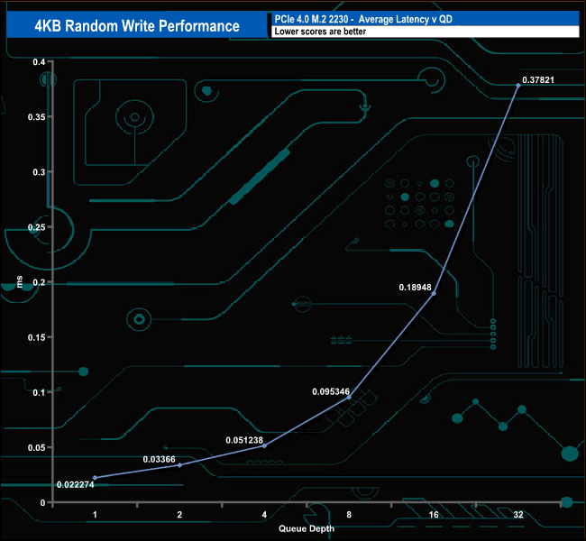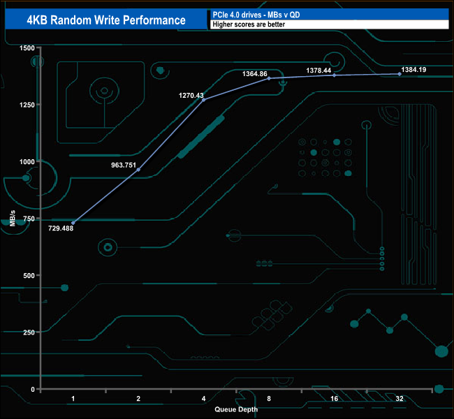 The random write performance of the drive sees in the bottom third of the table at QD1, dropping down to the penultimate position at QD2 before staging a recovery at QD4, with the drive climbing up the chart to finally sit in a mid-table position at QD32.