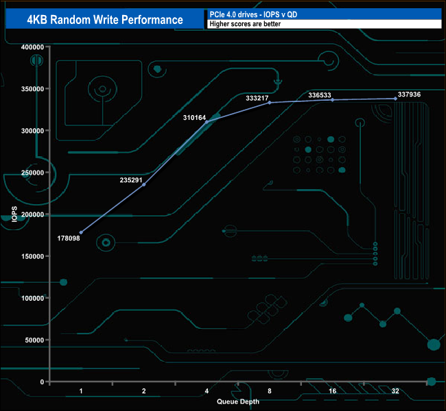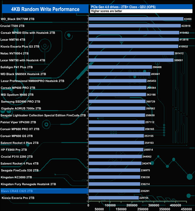 Klevv rates the 4K random write performance of the 2TB Cras C925 as up to 100,000,000 IOPS. With our four threaded tests, we couldn't get close to this, the best we saw from the drive was 337,936 IOPS (QD32).