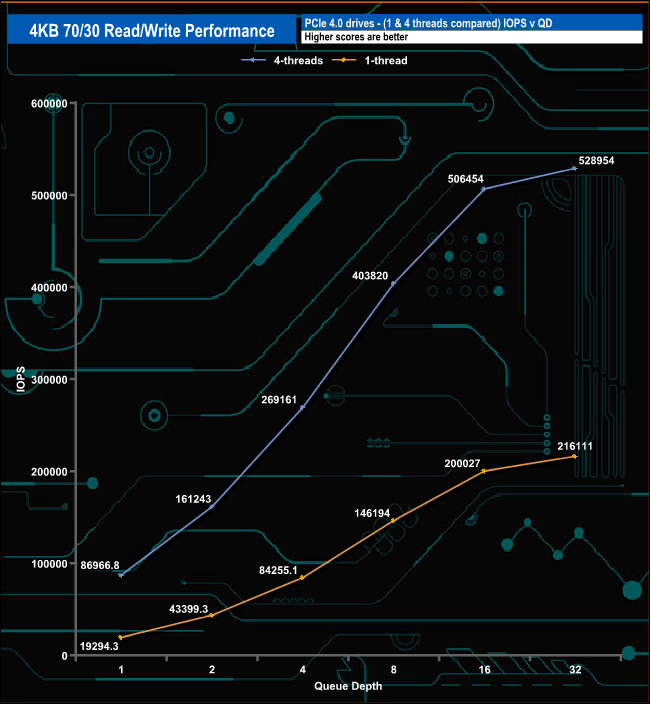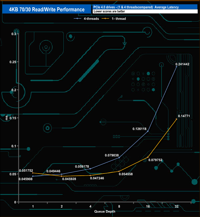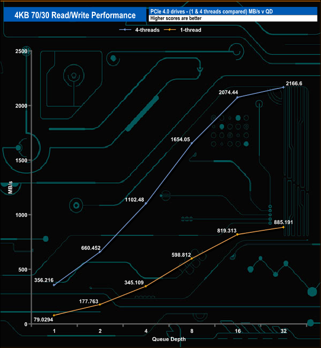 We used CrystalDiskMark 8’s custom settings to test the 4K 70/30 mixed read/write performance of the drive through a range of queue depths using a single thread and four threads.
