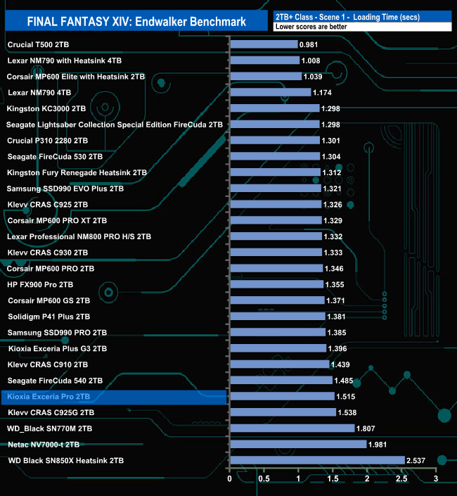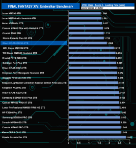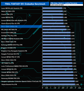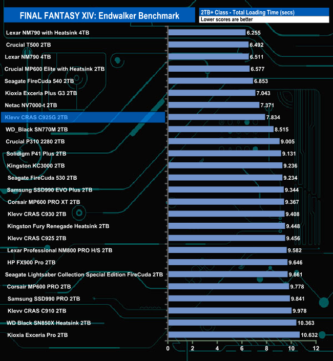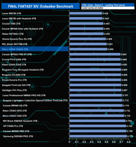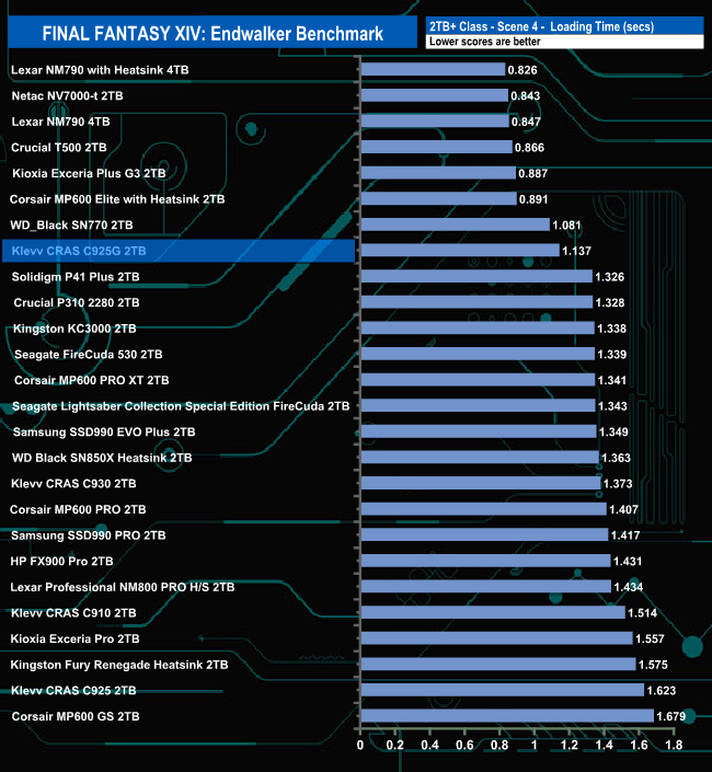 Klevv's 2TB CRAS C925G SSD makes a pretty decent job of the Final Fantasy XIV Endwalker Official Benchmark. It sits in the top ten of every scene load, apart from Scene 1, where it sits in the bottom half of the result chart.