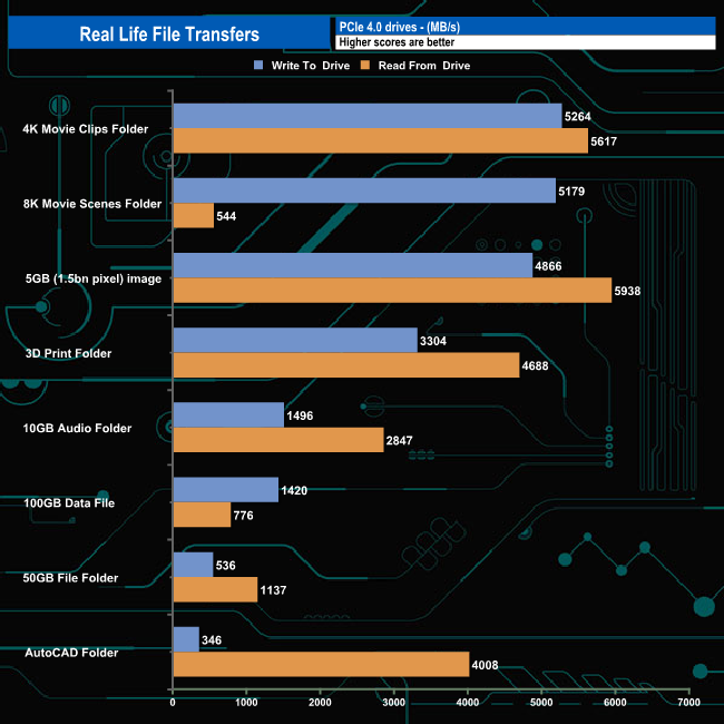 The CRAS C925G averaged 2,801MB/s (3 secs) when writing the contents of the 8 real-life transfer tests, with the fastest being the 4K Movie Clip folder at 5,264MB/s. The drive. Reading the data back, the fastest performance came from the 5GB image at 5,938MB/s and averaged 3,194MB/s for the eight transfers.