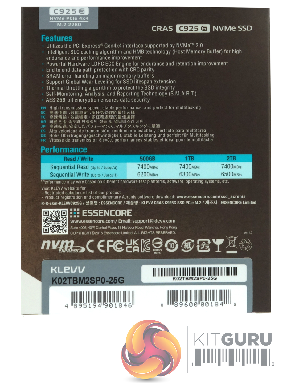 The rear of the box has a detailed feature list under which is a multi-lingual statement about transmission speed, stable performance and what the drive is good for. Under this is a performance table for all three drives in the range, displaying Sequential read/write speeds. To keep the drive cool, Klevv has used a thin graphene-copper composite heatsink, thinner and lighter than the heatsink supplied with the original CRAS C925.