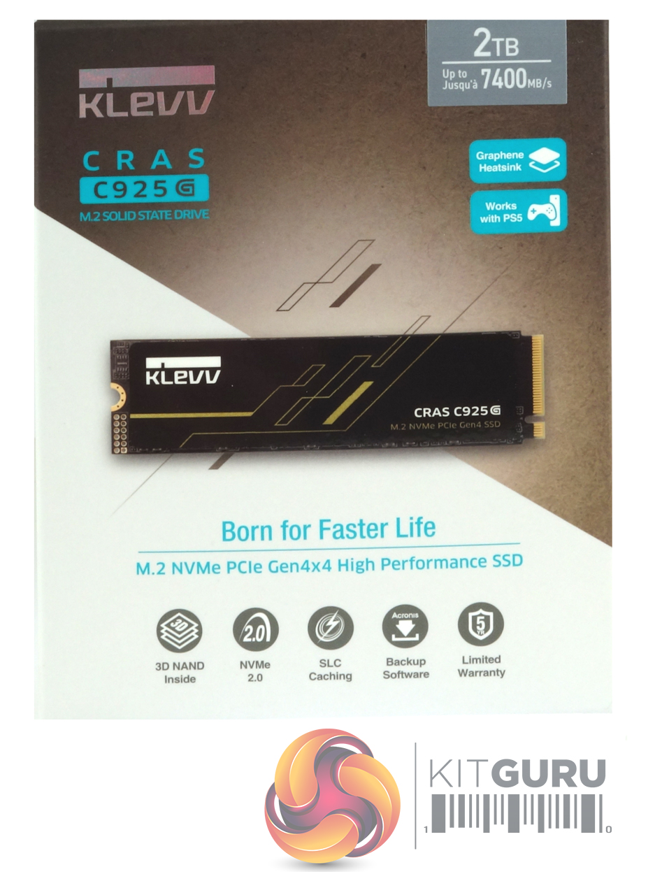 The Klevv CRAS C925G ships in a compact box with a clear image of the drive in the centre. Above this image, in the top right-hand corner, is a sticker which holds the drive's capacity (2TB) and maximum Sequential read speed (7,400MB/s). Under this, we find two more icons for the graphene heatsink and the fact that the drive works with PS5. Below the drive's image is a row of five icons for 3D NAND, NVMe 2.0, SLC Caching, Backup software and a 5-year limited warranty.