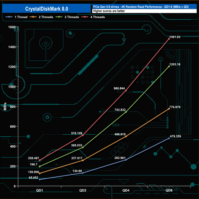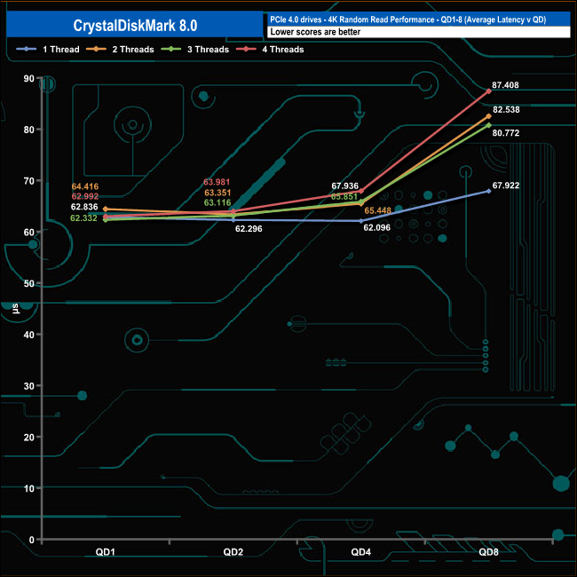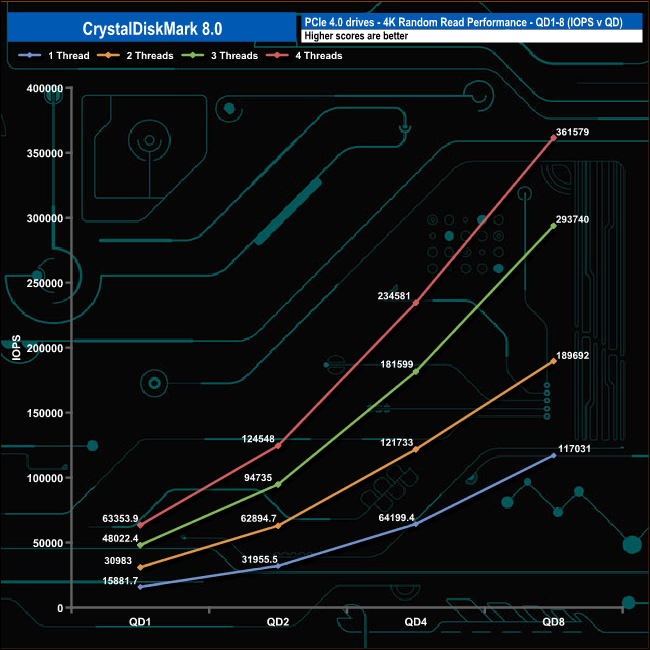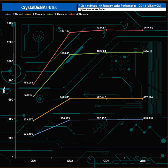 We used CrystalDiskMark 8 to test the random performance of the drive at lower queue depths (QD1 – QD8, where most of the everyday workloads occur) using 1 to 4 threads.