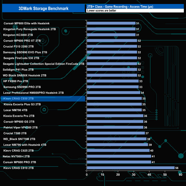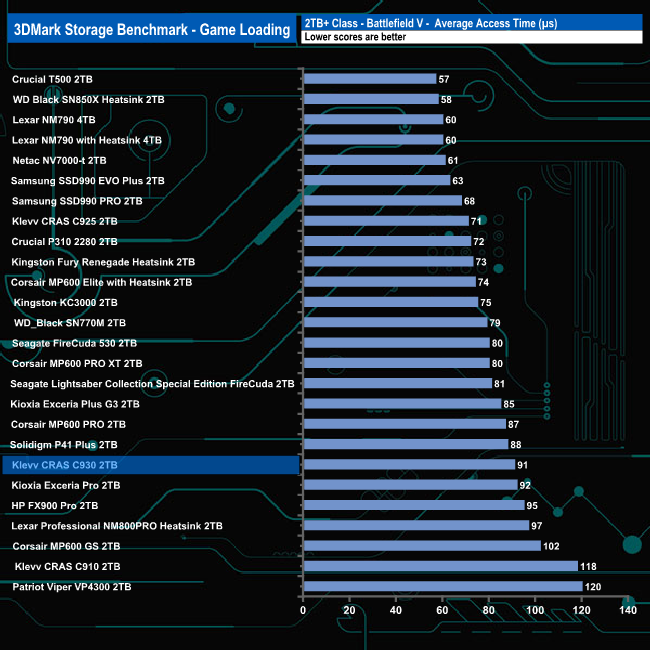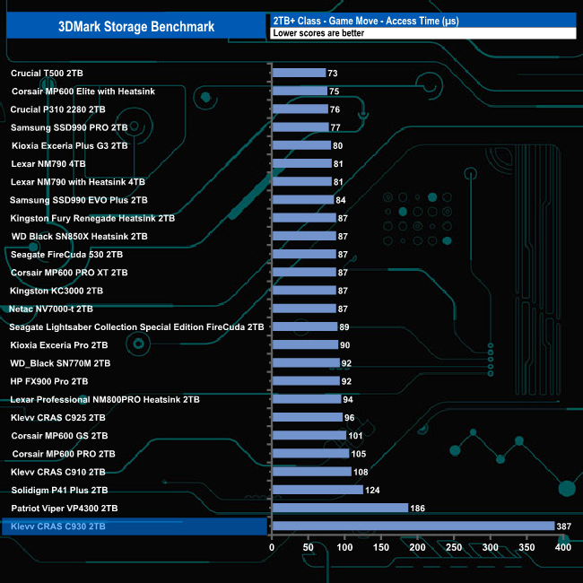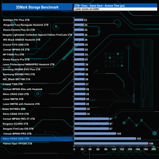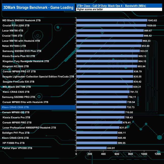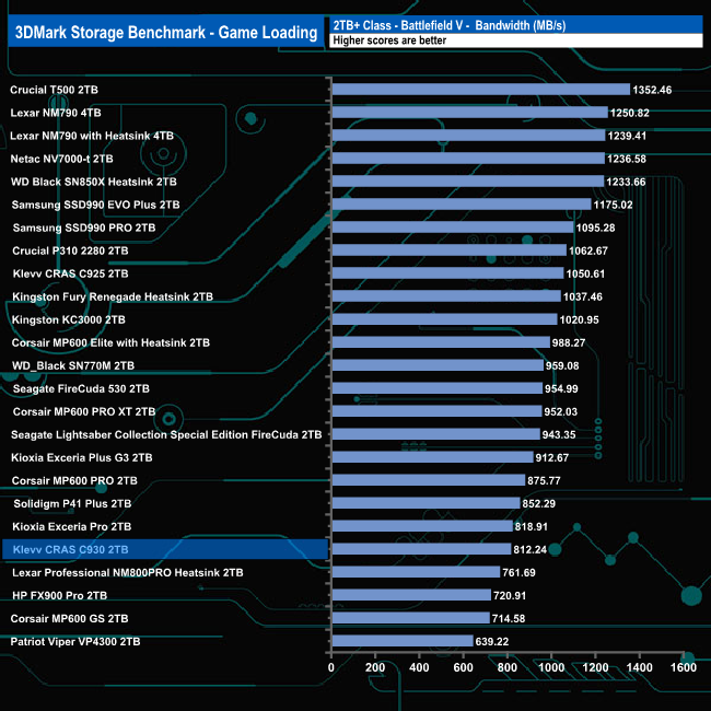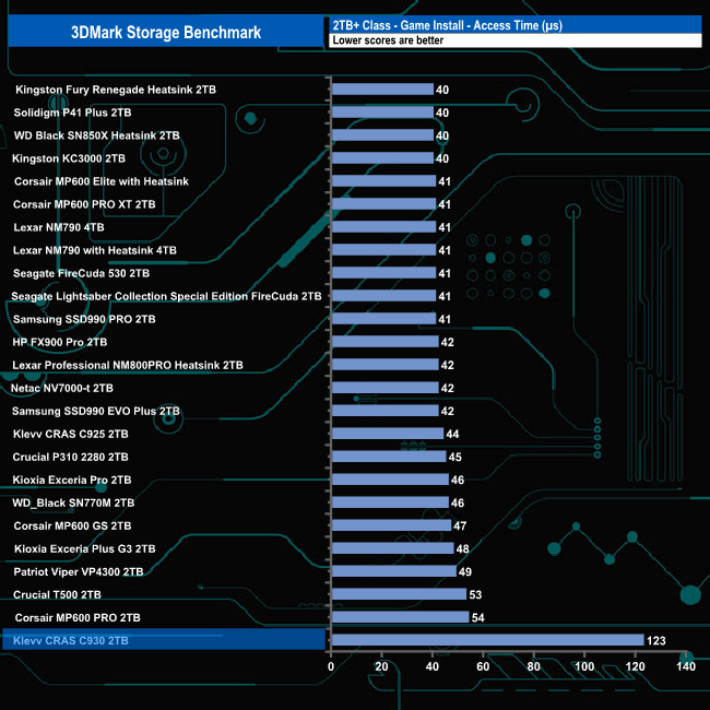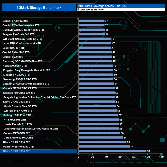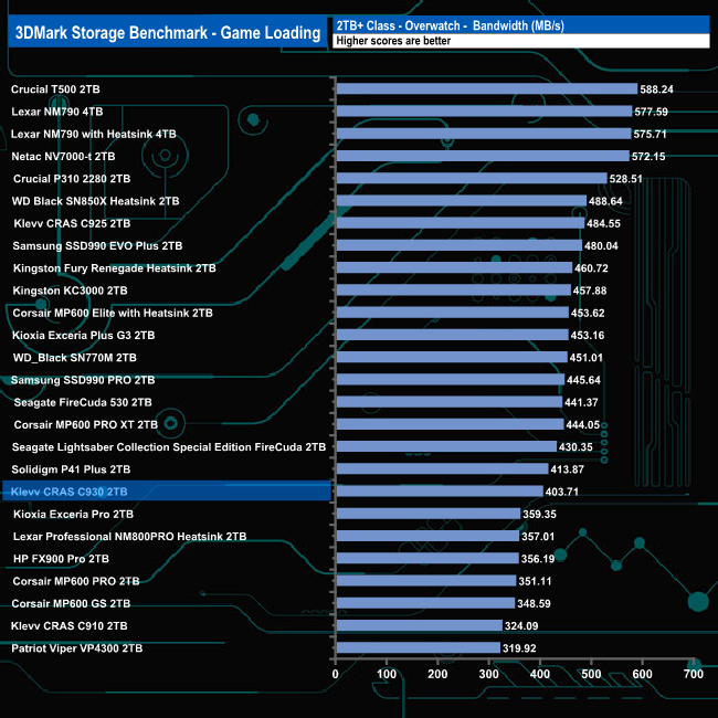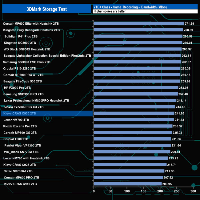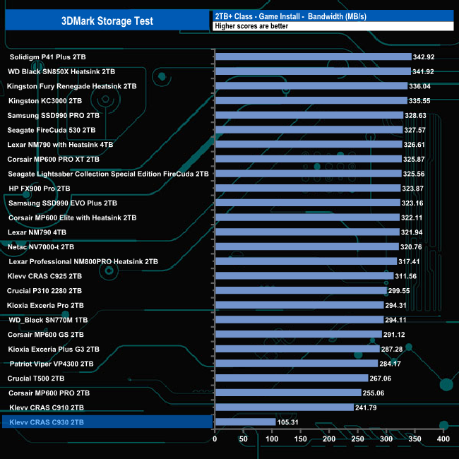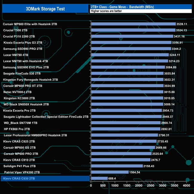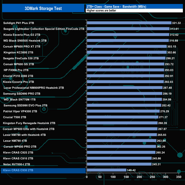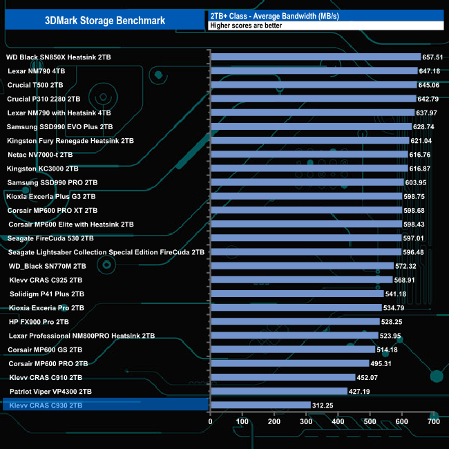 Further proof of how the Klevv CRAS C930 struggled with the 3DMark Storage Benchmark tests is its overall bandwidth figure, which puts it into last place in the table, 114.69MB/s behind the next slowest drive.