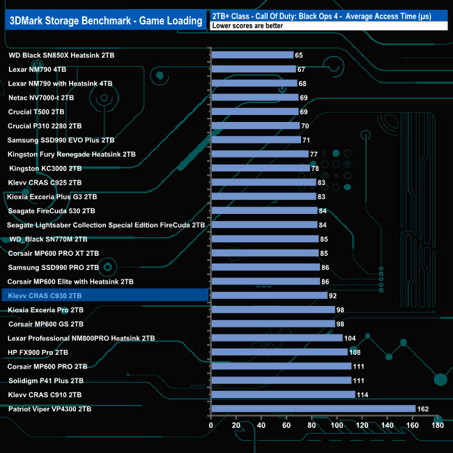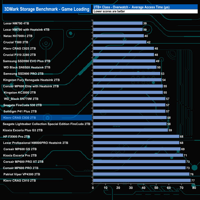 The Overwatch game loading test finds the drive in the bottom half of the results chart, faster than the CRAS C910 but slower than the C925, which is further up the results chart.