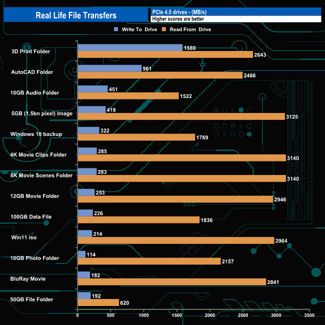 The 2TB CRAS C930 averaged 421.69MB/s when writing the contents of the 13 real-life transfer tests, with the fastest being the 1,580MB/s (3 secs) for the 3D Print files folder and the slowest the 114MB/s (94 secs) for the 10GB Photo folder transfer. Reading the data back, the drive averaged 2,398MB/s with the fastest performance coming with the 4K folder transfer at 3,140MB/s (5 secs), with the 50GB file transfer the slowest, at 620MB/s (87 secs).