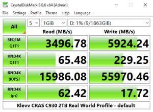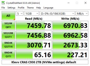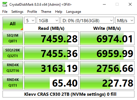 A glance at the benchmark result screens shows that using the default test, we could confirm both official Sequential figures (7,400MB/s reads, 6,800MB/s writes) with test results of 7,459MB/s for reads and 6,970MB/s for writes.