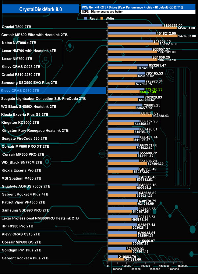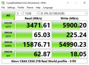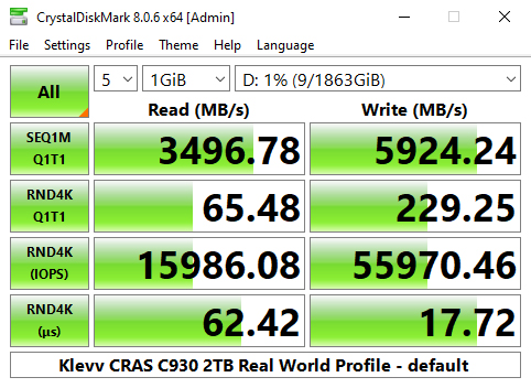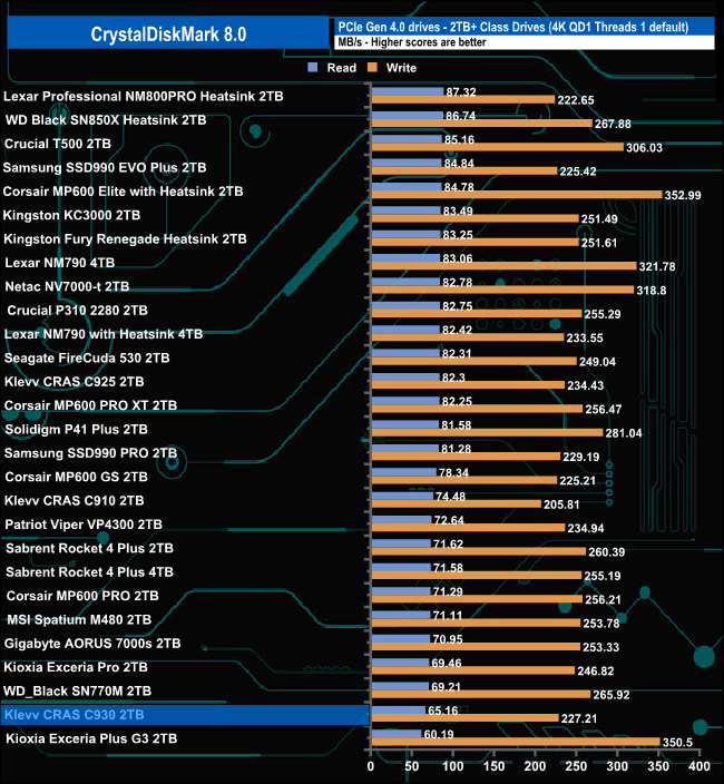 The 2TB CRAS C930 read score of 65.16MB/s in CrystalDiskMark 8's 4K QD1 test sees it near the bottom of the results chart as the second slowest we've seen. It's write result of 227.21MB/s is the third slowest we've seen.