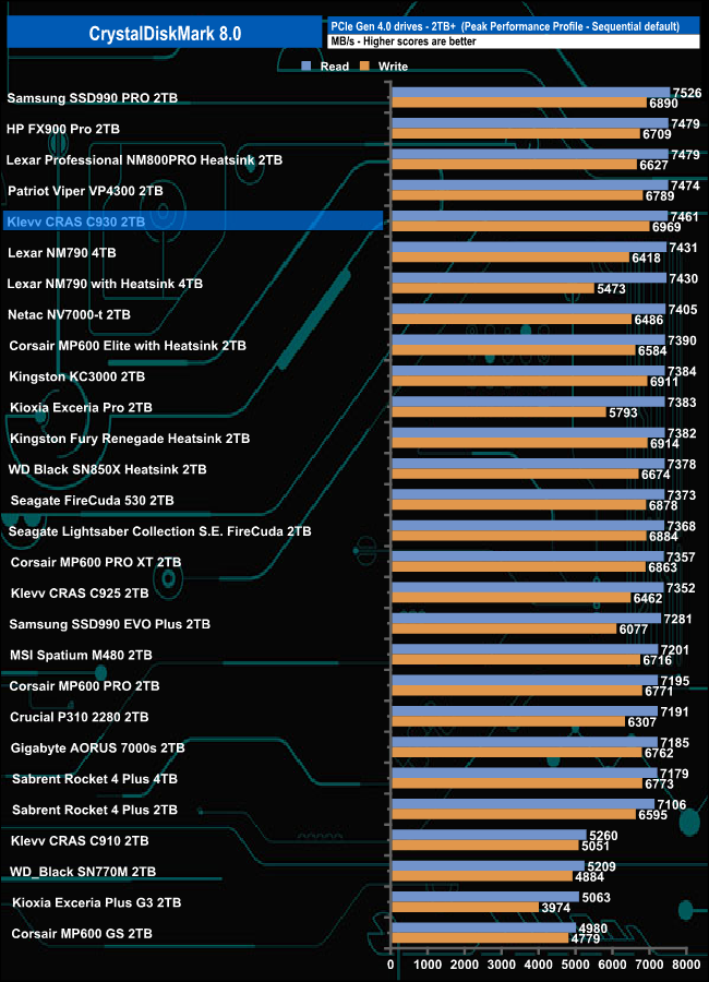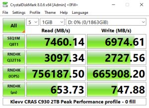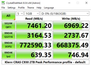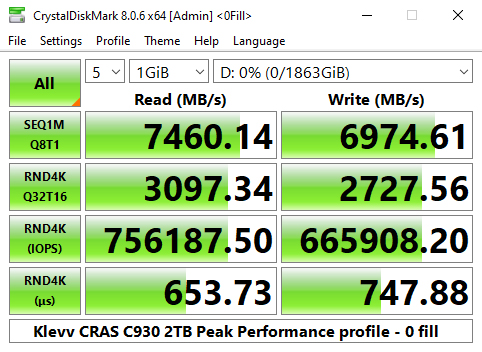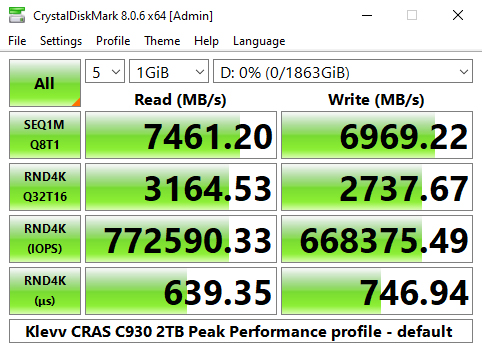 As with the default test, we could confirm both the official maximums (7,400MB/s reads, 6,800MB/s writes) for Sequential performance with test results of 7,461 MB/s for reads and 6,969MB/s for writes.