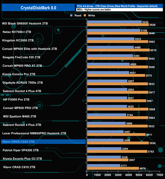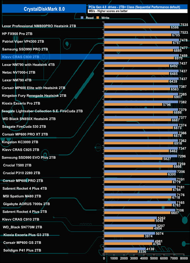 The sequential read test result sees the drive in the fifth place on our result chart, although its write score of 6,970MB/s is the fastest we've seen for a Gen4 drive to date in this particular test.