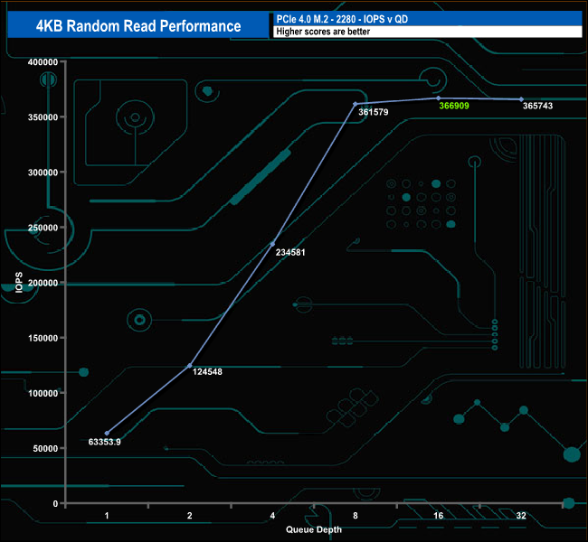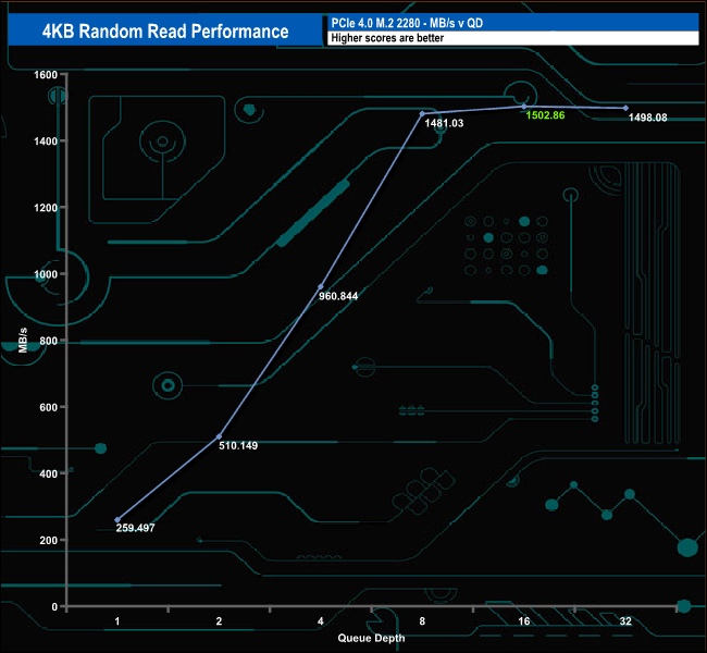 We used CrystalDiskMark 8‘s custom settings to test the 4K random read performance of the drive through a range of queue depths. The setup for the tests is listed below.