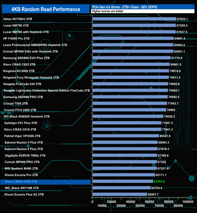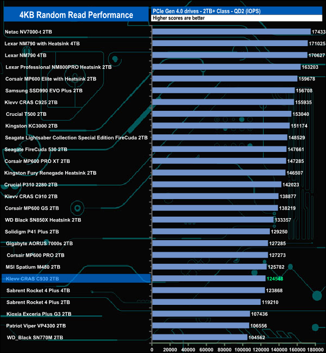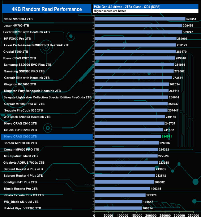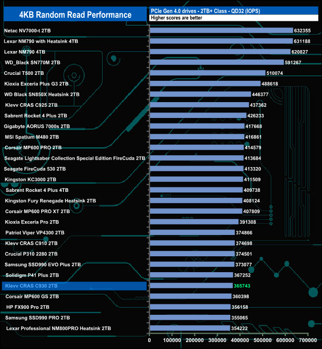 Officially, the 2TB CRAS C930 is rated as up to 1,000K IOPS for 4K random reads. With our four-threaded tests, we couldn't get close to the official figure with a peak test result of 366,909 IOPS (1,502.86MB/s) at QD16.