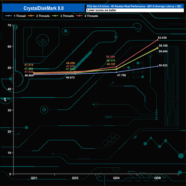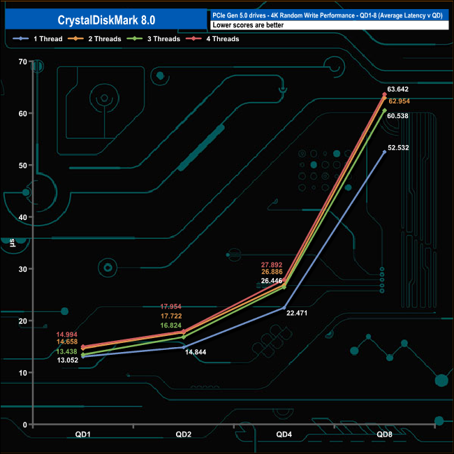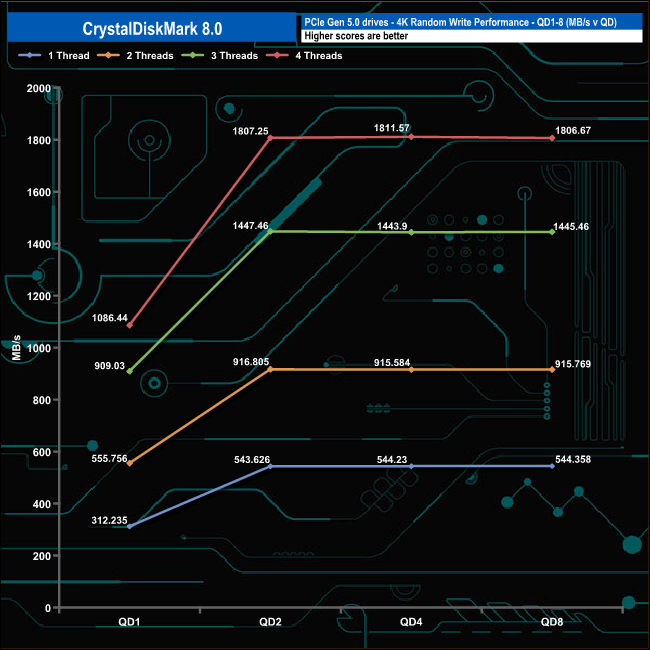 We used CrystalDiskMark 8 to test the random performance of the drive at lower queue depths (QD1 – QD8 where most of the everyday workloads occur) using 1 to 4 threads.